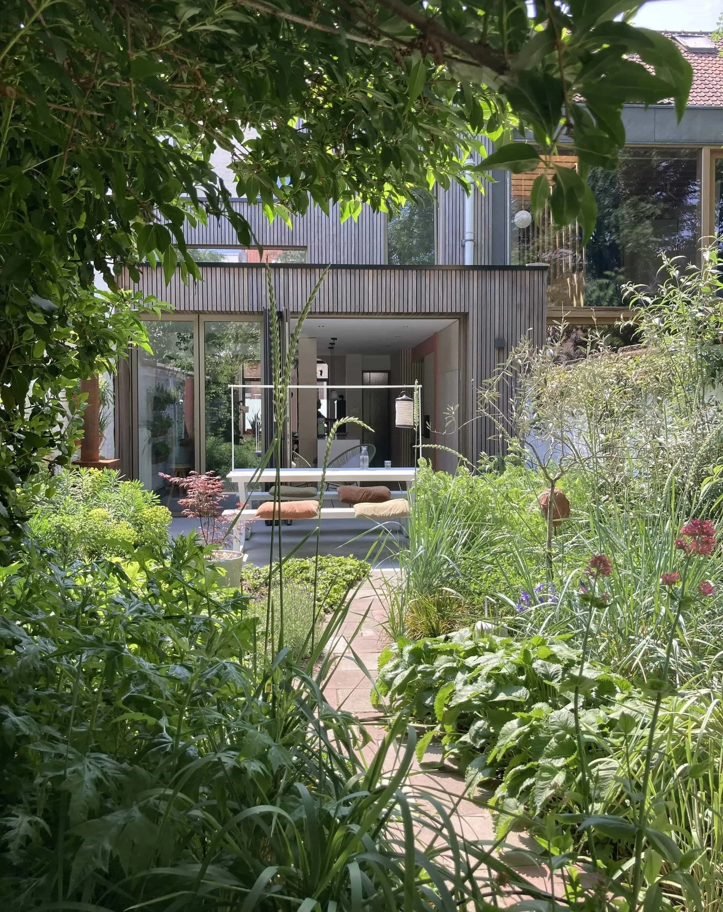De tuin moest aansluiten bij hun manier van leven en wonen: informeel, graag zelf aan de slag, met smaak, aandacht voor materialen en kleur, en liefde voor natuur. Klassiek gazon hoefden ze niet β wel een plek die uitnodigt om te dwalen, te zitten en die het hele jaar door de moeite waard is om door de grote glazen pui te bekijken. Een buitenkamer met een persoonlijke feel, als verlengstuk van het huis.